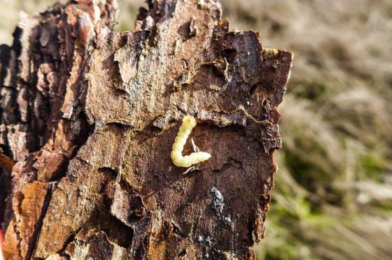 Larwa przypłaszczka granatka pod korą. Fot. M. Tylicki