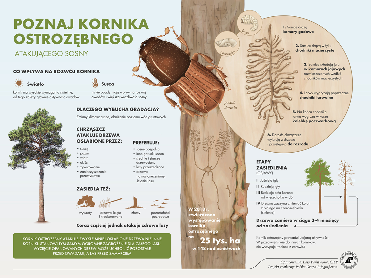 • Kornik ostrozębny: chrząszcz, który żeruje wysoko w koronie drzewa, gdzie kora jest cienka. To sprawia, że ślady jego obecności są widoczne dopiero wtedy, gdy drzewo zacznie całkowicie obumierać. Korniki ostrozębne atakują osłabione drzewa i masowo się namnażają, gdy takich drzew jest więcej, tak jak w przypadku lasów pod Piasecznem.